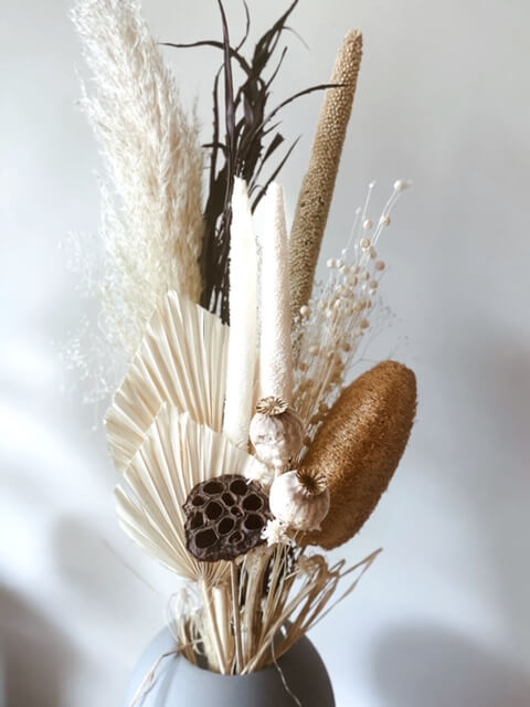 Iga meie loodud kuivlilledest lillekimp on unikaalne ja naturaalse välimusega. Värvigammadest kasutame naturaalseid, pleegitatud ja heledaid toone, mis sobivad ideaalselt skandinaavialikku interjööri. Kõik seaded on seatud kimbuks ja on soovitav ka sel kujul veeta vaasi seada. Seade on soovitatav lõigata vaasi kõrgusest lähtuvalt parajaks.